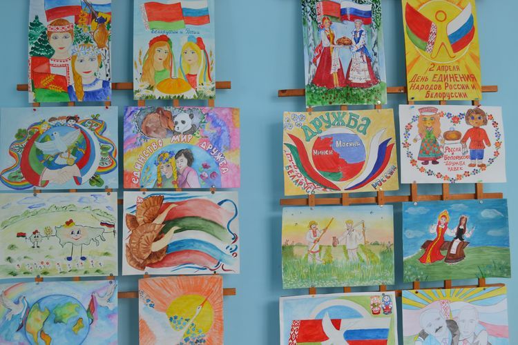 В зале была развернута выставка рисунков учащихся образовательных учреждений района, посвященная российско-белорусским отношениям.