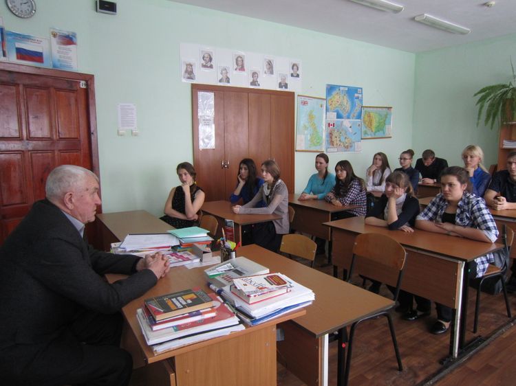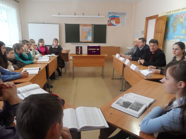 В уютном кабинете собрались старшеклассники (8-11 классы) – представители ученических советов «Старшеклассник», «Лидер», учителя истории: Миненкова Е.В., Лыков А.Ю. (руководитель школьной музейной комнаты «Память»), руководитель МО классных руководителей Корнеева М.В., преподаватель-организатор ОБЖ Сысоев С.Н., вожатая школы Мартынова Е.М. и председатель совета ветеранов Черемисиновского района Жигулин Анатолий Иванович.