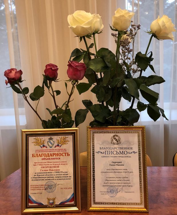 На итоговом заседании Общественного совета при УМВД России по Курской области Генерал-майор полиции Виктор Анатольевич Косарев, начальник регионального УМВД объявил Благодарность Галине Павловне, как председателю Общественного совета Благодарность «За взаимодействие с УМВД России по Курской области и личный вклад в общественную работу, направленную на безопасность жителей и гостей региона».