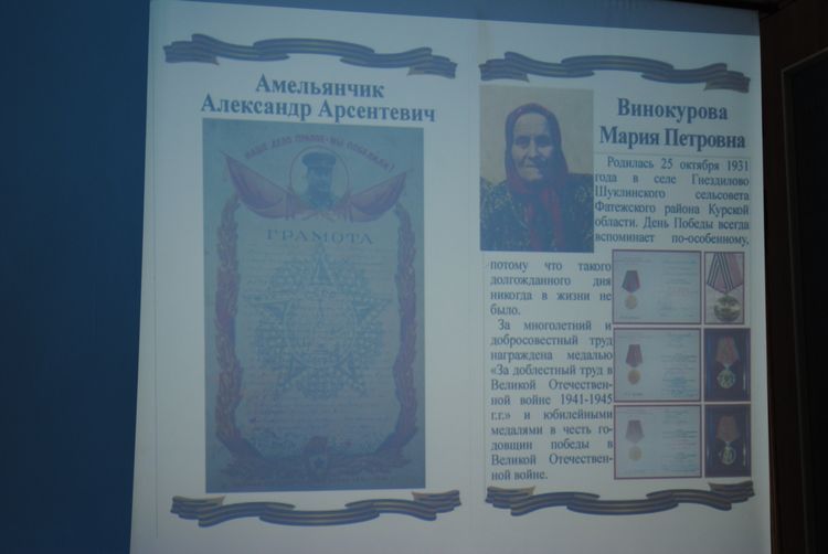 Соловьева Т.Н., проректор Курской ГСХА, выступила перед работниками межпоселенческих библиотек Беловского района (50 человек), студенты академии читали стихи о войне, пели военные песни. Выступления студентов были эмоциональны, присутствующие были тронуты отношением молодежи к военному прошлому страны.